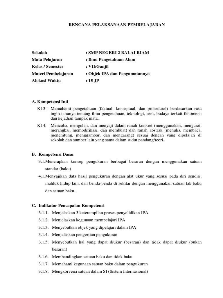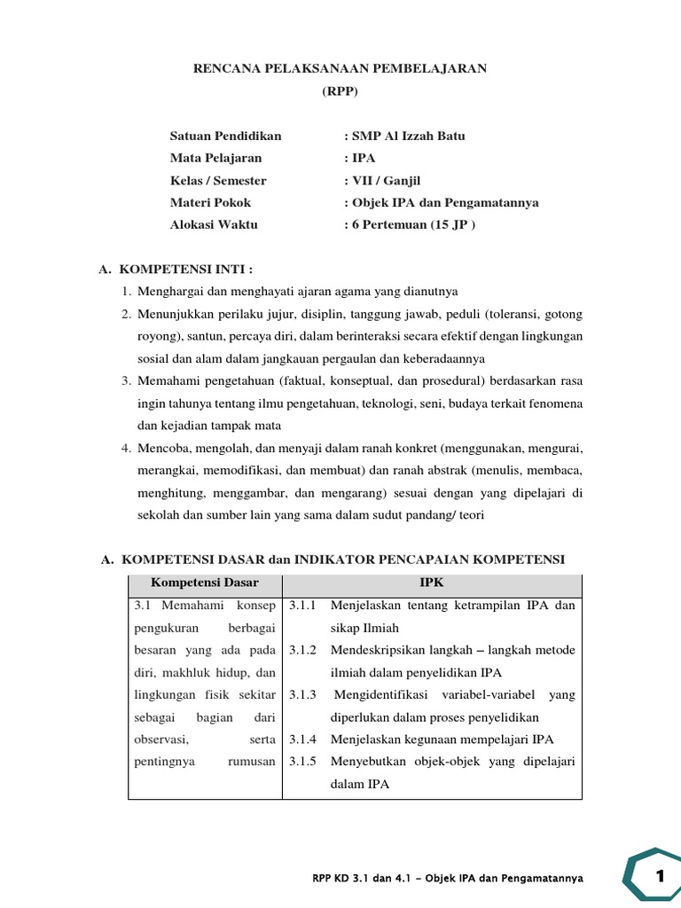 RPP Satuan Pendidikan. RPP IPA TERBARU KELAS VII K13 31 Objek IPA dan Pengamatannya 2018 RENCANA PELAKSANAAN PEMBELAJARAN. RPP Kelas VII Materi Objek IPA dan Pengamatannya Honorer.