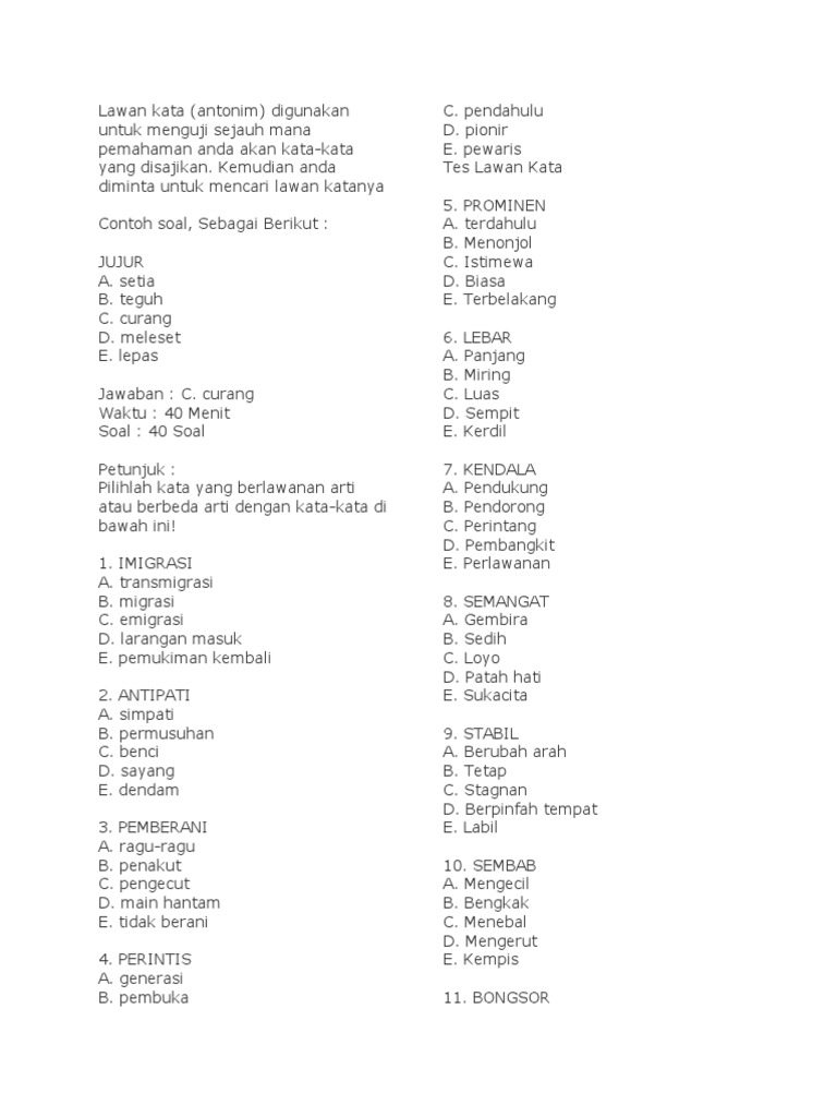 3 Contoh Soal Tpa Antonim Lawan Kata Dan Kunci Jawaban Tes Antonim 2 Docx