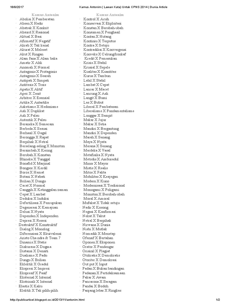 Kamus Antonim Lawan Kata Untuk Cpns 2014 Dunia Article Pdf